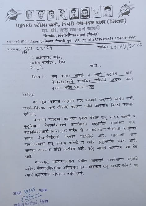 यावेळी राष्ट्रवादी कॉंग्रेस पिंपरी-चिंचवड शहर जिल्हा चिटणीस राजू चांदणे यांनी सांगितले की, दि. ०७/०९/२०२१ रोजीही तक्रार अर्ज केला होता पण यावर लक्ष दिले नाही. जवळपास दीड वर्ष सतत तक्रारी दिल्या आहेत. मात्र सारे काही पालथ्या घड्यावर पाणी. याबाबतचे तक्रारदार नवनाथ श्रीपती आडागळे, रा. चंदननगर गावठाण, मांडवगण फराटा, ता. शिरुर, जि. पुणे यांचा दिनांक ०७/०९/२०२१ रोजीचा तक्रार अर्ज तहसिलदार, शिरुर महाराष्ट्र शासन जिल्हाधिकारी पुणे या कार्यालयास प्राप्त झालेला आहे.