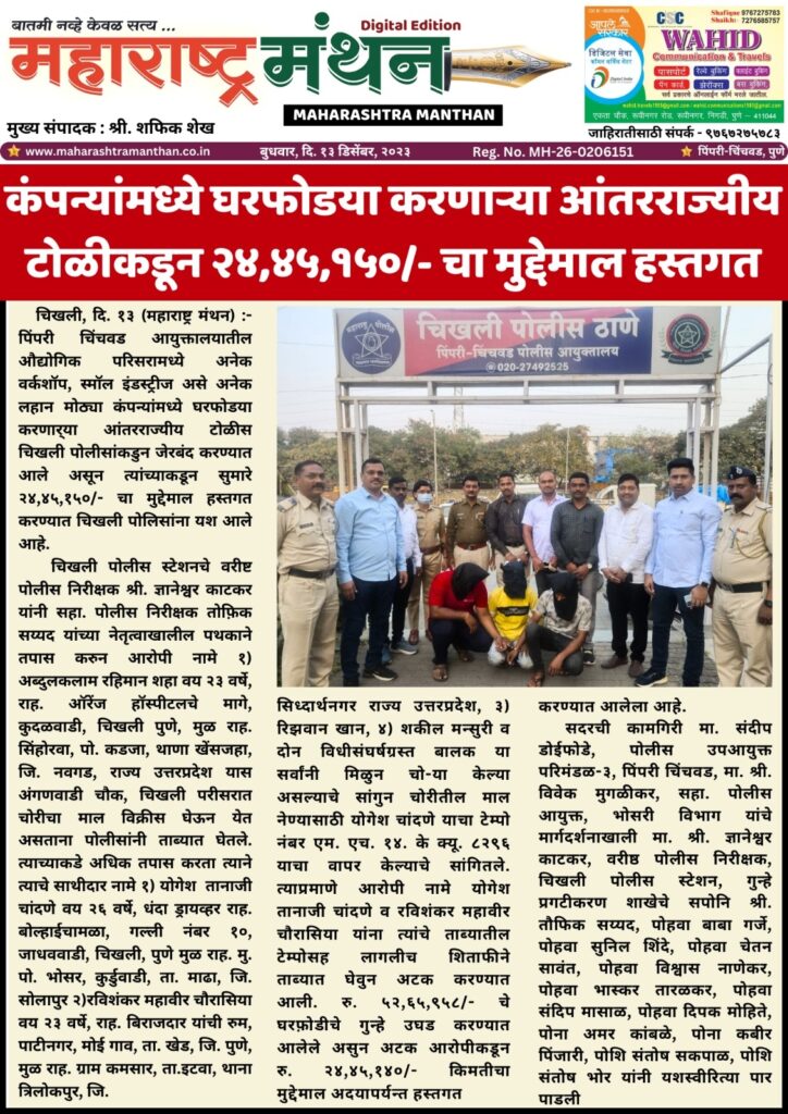 कंपन्यांमध्ये घरफोडया करणार्या आंतरराज्यीय टोळीकडून २४,४५,१५०/- चा मुद्देमाल हस्तगत
