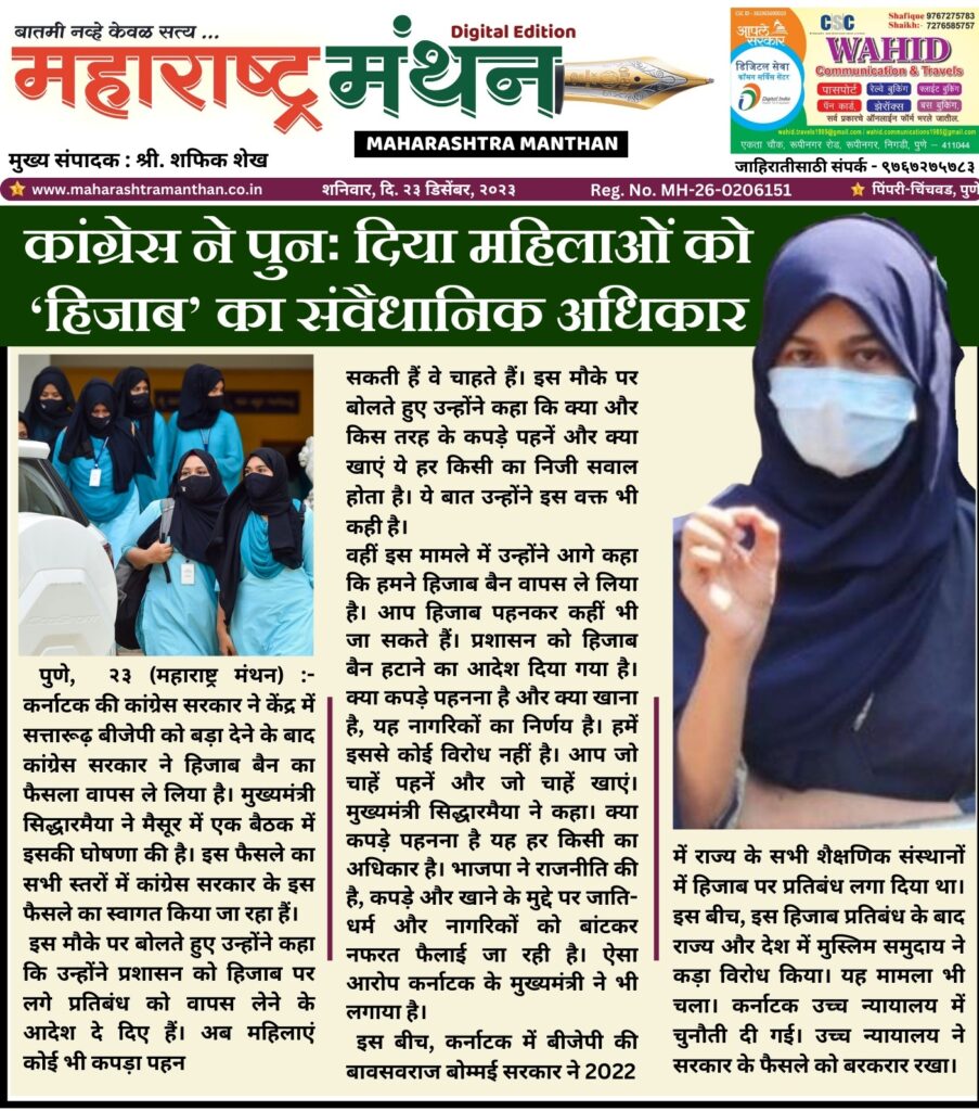कांग्रेस ने पुनः दिया महिलाओं को ‘हिजाब’ का संवैधानिक अधिकार