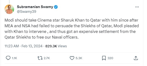 दिल्ली, दि. १३ (महाराष्ट्र मंथन):- कतारमध्ये हेरगिरीच्या आरोपात मृत्युदंडाची शिक्षा सुनावलेल्या आठ माजी नौदल अधिकारी यांना मोठी राजकीय मुत्सद्देगिरी करून भारतात परत आणल्याचे श्रेय भारतीय जनता पार्टीने लाटल्यानंतर या प्रकरणाबाबत मोठे खळबळजनक विधान सुब्रमण्यम स्वामी यांनी केले आहे. स्वामी यांनी त्यांच्या ट्विटर अकाऊंटवरून म्हटले आहे की, सोशल मीडिया X वरील पंतप्रधानांच्या पोस्टला उत्तर देताना लिहिले होते की पंतप्रधान मोदींनी शाहरुख खानला आपल्यासोबत कतारला घेऊन जावे कारण परराष्ट्र मंत्रालय आणि NSA कतारच्या शेखांना पटवण्यात अपयशी ठरले आहेत. पीएम मोदींनी पुन्हा शाहरुख खानला या प्रकरणात हस्तक्षेप करण्याची विनंती केली. अशा प्रकारे आमच्या माजी नौदल अधिकाऱ्यांना मुक्त करण्यासाठी कतारच्या शेखांशी तडजोड झाली.