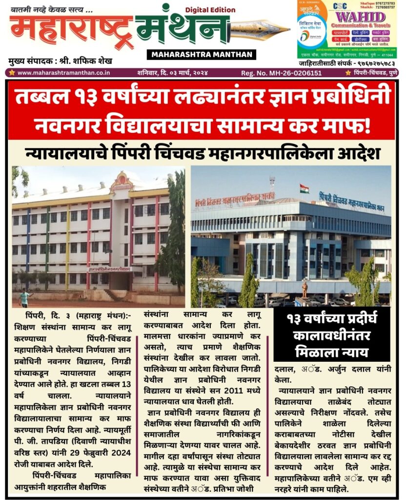 तब्बल १३ वर्षांच्या लढ्यानंतर ज्ञान प्रबोधिनी नवनगर विद्यालयाचा सामान्य कर माफ!