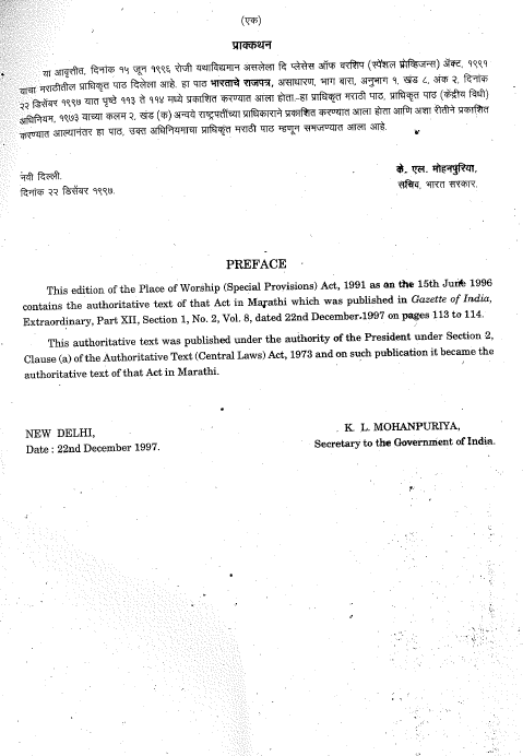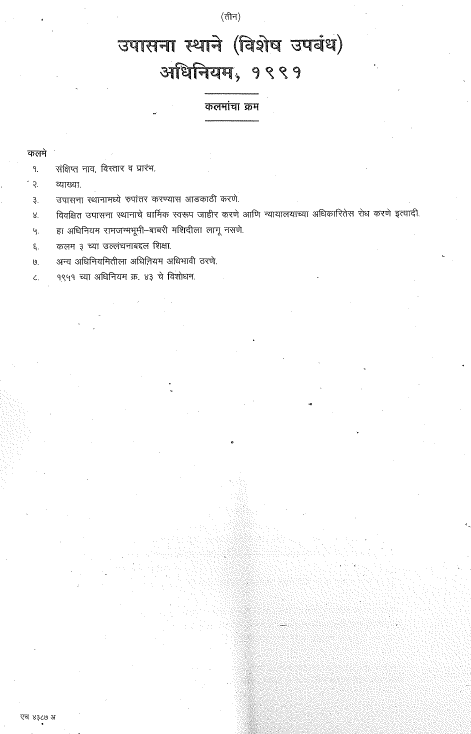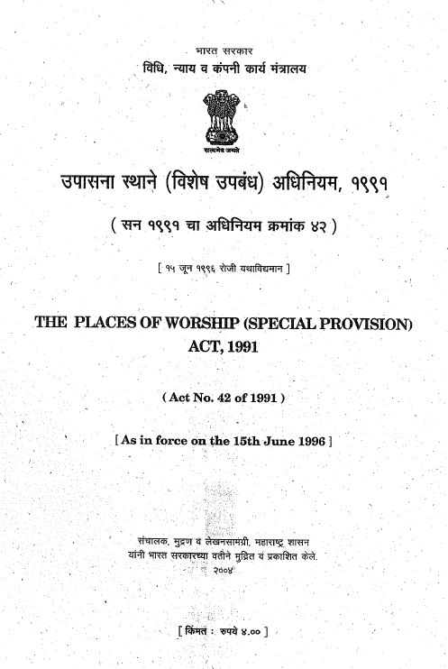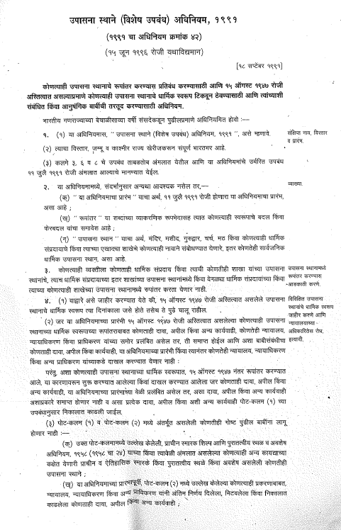 काय आहे उपासना स्थाने (विशेष उपबंध) अधिनियम १९९१, अधिनियम क्रमांक ४२ पहा पूर्ण कायदा