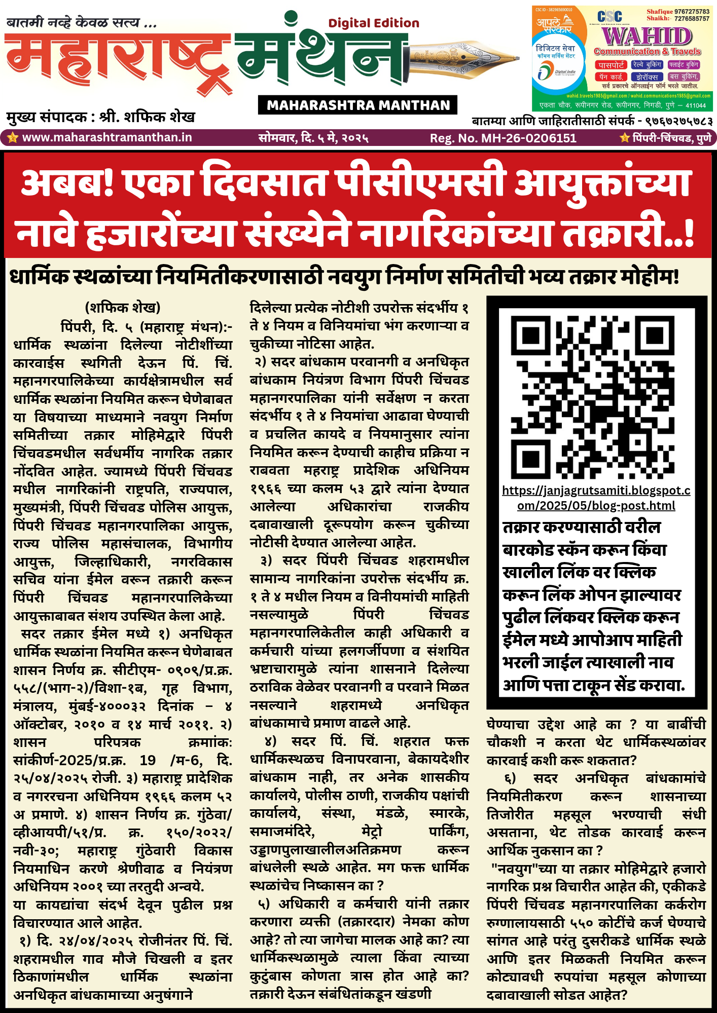 धार्मिक स्थळांच्या नियमितीकरणासाठी नवयुग निर्माण समितीची भव्य तक्रार मोहीम!
